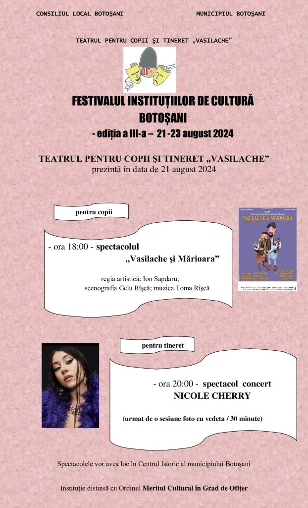 Teatrul pentru Copii şi Tineret „Vasilache” vă invită astăzi, 21 august 2024, în centrul istoric al municipiului Botoşani să vizionaţi două spectacole de excepţie ce vor fi prezentate în cadrul Festivalului Instituţiilor de Cultură, aflat la cea de-a III-a ediţie.