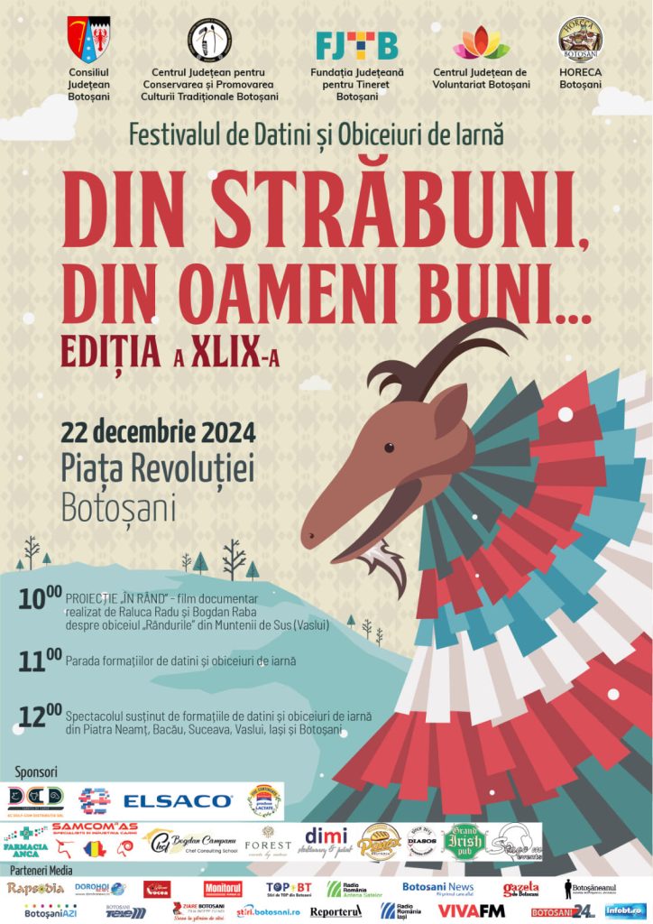 Cea de-a XLIX-a ediție a Festivalului de Datini și Obiceiuri „Din străbuni, din oameni buni…” se va desfășura duminică, 22 decembrie 2024, în centrul Municipiului Botoșani.