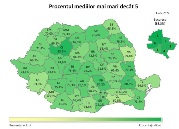 În București și județele Cluj și Brăila, peste 80% dintre elevi au obținut medii peste 5, respectând tradiția.