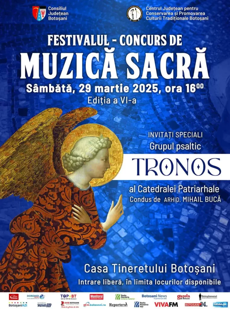 Sâmbătă, 29 martie 2025, începând cu ora 15.00, se va desfășura la Casa Tineretului din municipiul Botoșani, Festivalul Concurs de Muzică Sacră, ediția a VI-a, organizat de Consiliul Județean Botoşani, prin Centrul Județean pentru Conservarea și Promovarea Culturii Tradiționale Botoșani – Centrul Creației Botoșani.