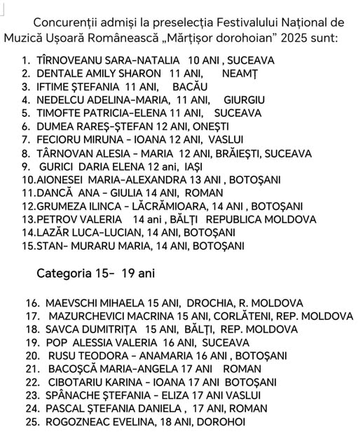 După preselecție, 25 de tineri artiști vor cânta pe scena celei de-a XLI-a ediție a Festivalului Național de Muzică Ușoară Românească „Mărțișor Dorohoian”, ce va avea loc în perioada 28 februarie – 1 martie 2025.