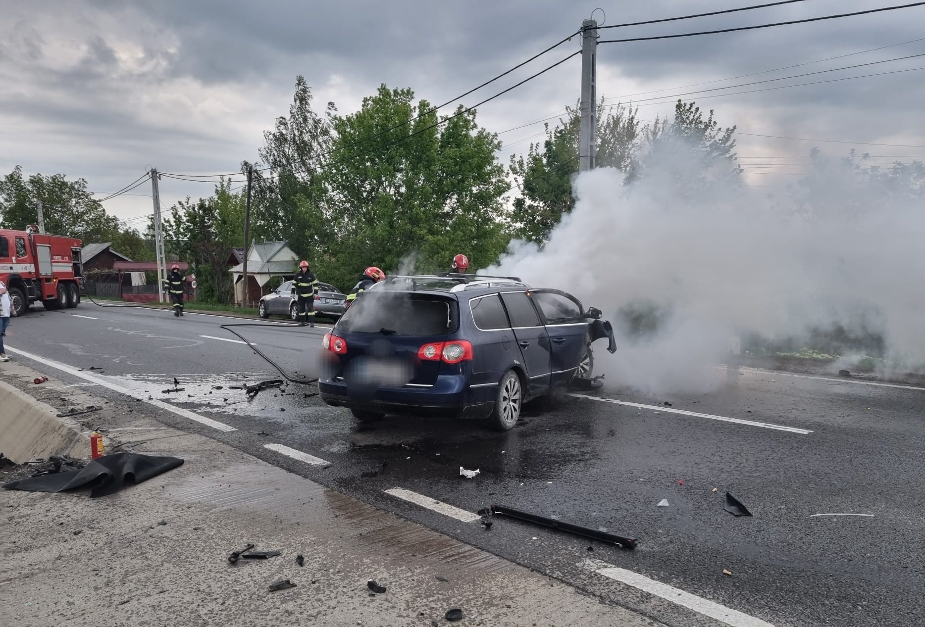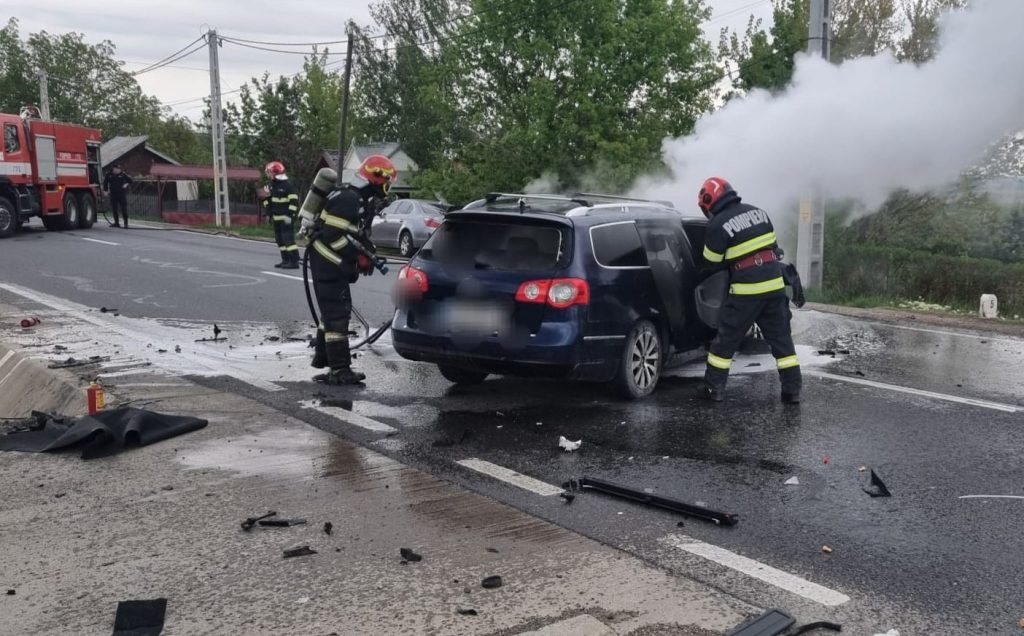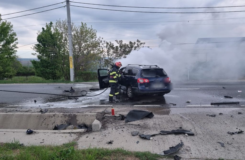 Mașină cuprinsă de flăcări în urma unui accident rutier produs în această dimineață (foto)