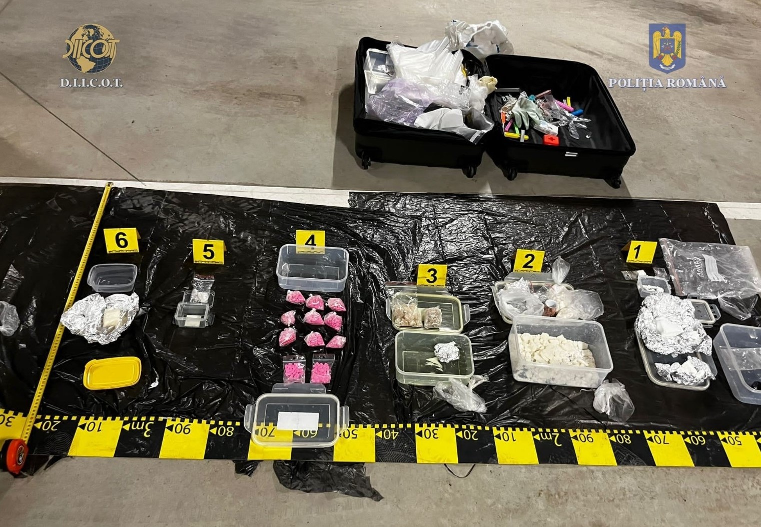 În urma unor percheziții efectuate, în locuința și în autoturismul persoanei cercetate, au fost descoperite și ridicate peste 230 de grame de cocaină, 134 de grame de substanță cristalină 4-CMC, 516 comprimate de ecstasy și peste 430 de grame de substanță psihoactivă 2-MMC, ambalate în diverse pungi și casolete, mai multe cântare, peste 140.000 de lei, precum și alte mijloace de probă.