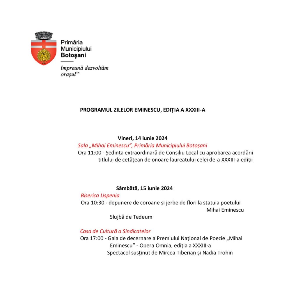 Vineri, 14 iunie 2024, la ora 11.00, în Sala „Mihai Eminescu” a Primăriei Municipiului Botoșani va avea loc ședința extraordinară de Consiliu Local, în care se va aproba acordarea titlului de Cetățean de Onoare al municipiului Botoșani poetului laureat al actualei ediții.