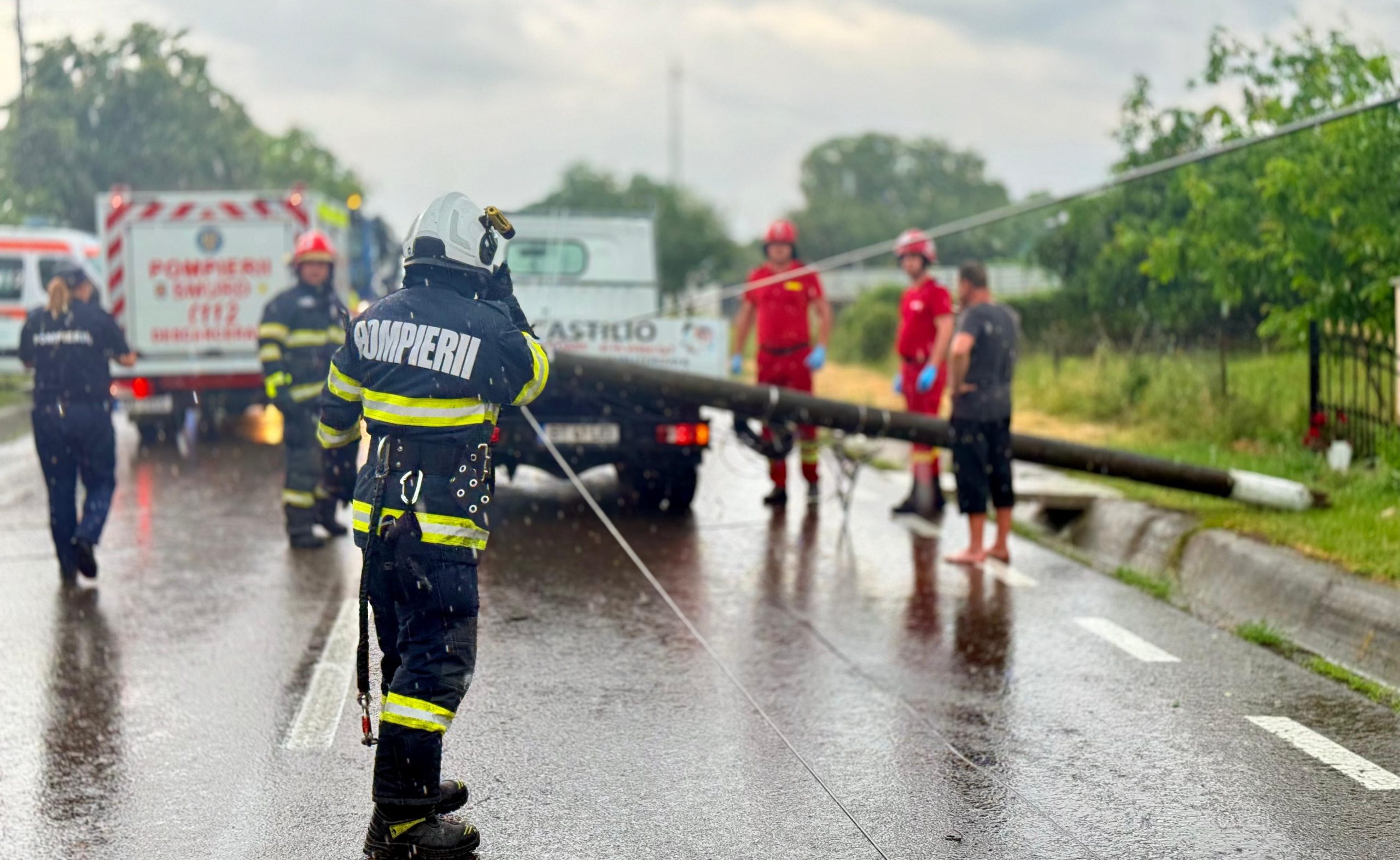 În această după-amiază, pompierii au fost solicitați să intervină pe DJ 208 C, în localitatea Orășeni Deal, unde un stâlp de telefonie a fost doborât de vânt și a căzut peste o autoutilitară.