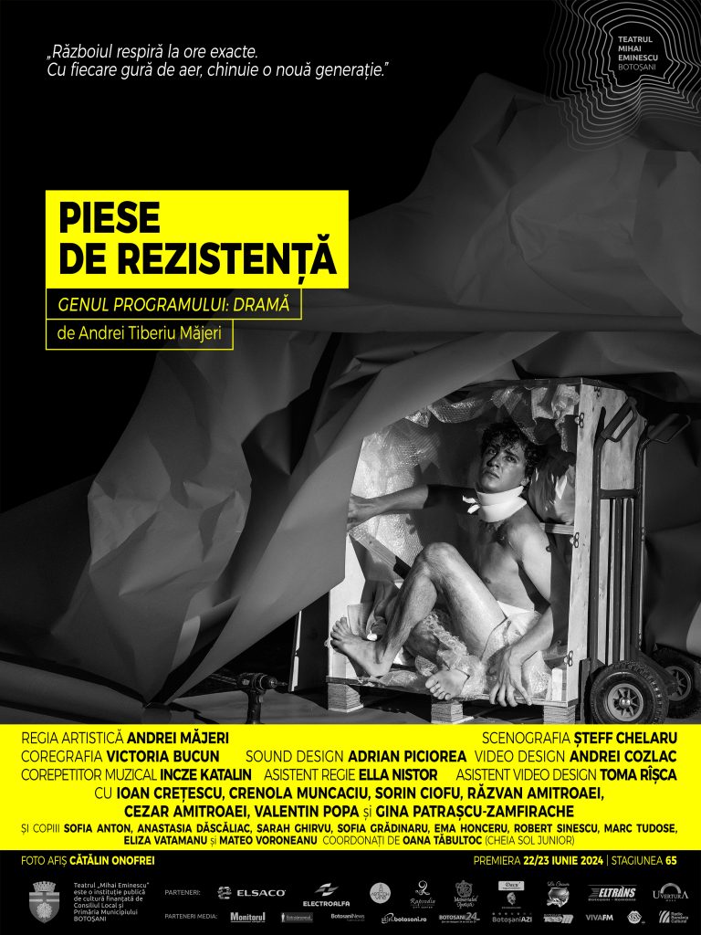Sâmbătă, 29 iunie și duminică, 30 iunie, de la ora 18.00, Teatrul „Mihai Eminescu” vă invită la Casa Tineretului, B-dul Mihai Eminescu nr. 48 la premiera spectacolului „Piese de rezistență”, o dramă de Andrei Tiberiu Măjeri.
