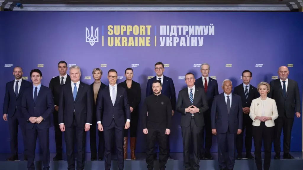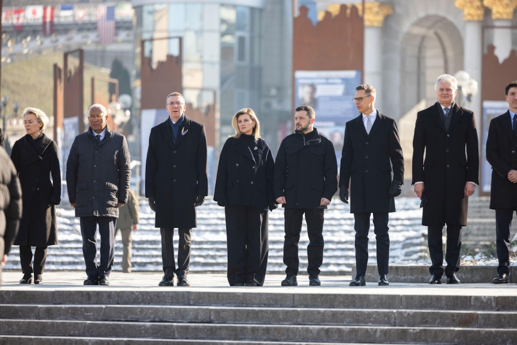 Kievul a marcat astăzi împlinirea a trei ani de la declanşarea invaziei ruse în prezența preşedintei Comisiei Europene, Ursula von der Leyen, a preşedintelui Consiliului European, Antonio Costa, și a mai multor comisari europeni. De asemenea, premierul spaniol Pedro Sanchez s-a aflat la Kiev, pentru „a reafirma sprijinul Spaniei pentru democraţia ucraineană şi pentru preşedintele Volodimir Zelenski”.